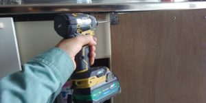 弊組合員:(株)東都企画の修繕工事をご紹介します。 小修繕・流し台扉の取り付け 新しく作った扉を丁番に取付 ”丁番”(ちょうばん) 開き扉を開閉するために支える金具 取付け完了、開閉も確認済みです