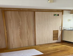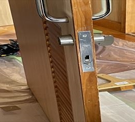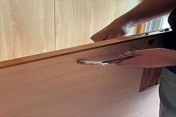 修繕:引き戸のカギ取付 投稿日: 2022年7月23日2022年9月8日 投稿者: 事務局 弊組合員:(株)東都企画の修繕工事をご紹介します。 前回【クロス張り】の続きとして、カギの取付を行います。 取手を取り付け、シリンダーを合わせます。