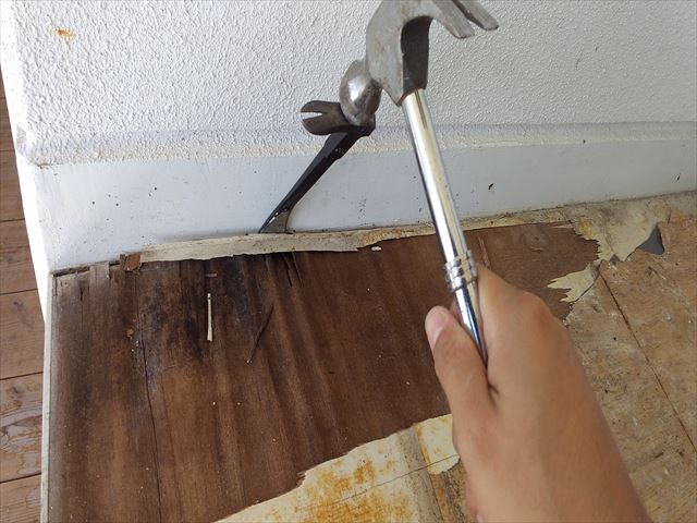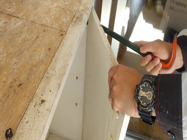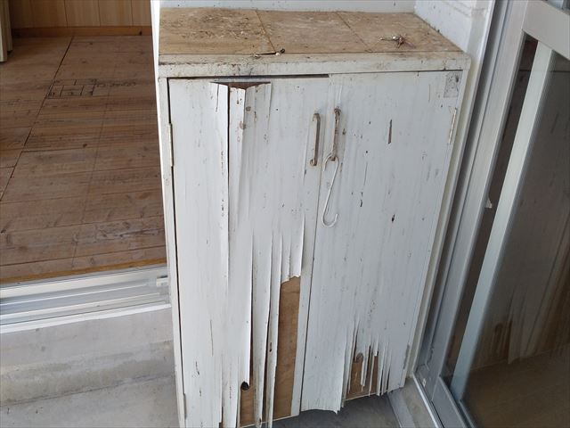 傷んだ靴箱を外した後に、作製した靴箱を取り付け。