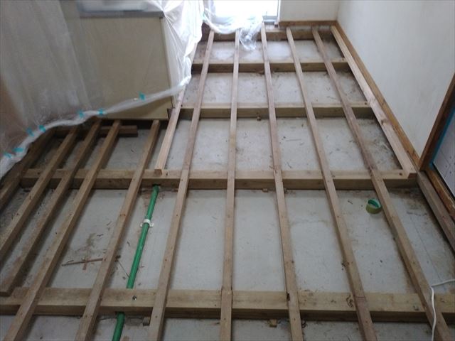 修繕:床の張替え工事 投稿日: 2023年8月7日2023年8月7日 投稿者: 事務局 弊組合員:(有)環衛開発の修繕工事をご紹介します。 長年の使用で、所々傷んでいる床を全面張替えの工事を行います。 全面の剥がし作業です、釘が残らないように気を付け、根太も補強します。 全て剥し終えると次は張替えです。 最後にコーキング打ちで整えて作業完了。