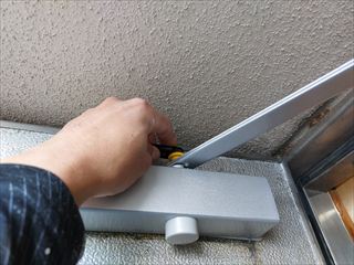 修繕:玄関ドアのクローザー交換 投稿日: 2025年1月20日2025年1月20日 投稿者: 事務局 弊組合員:(有)環衛開発の修繕工事をご紹介します。 玄関ドアのクローザーの交換です。 ・ドアクローザー ドアの上部に取付けられた金物 開けた扉が急に閉じる事が無い様にゆっくりと 自動で閉じていく動作をする働きがあります。 経年劣化のため、新しい品と交換です。 作業後、動作を確認し完了です。