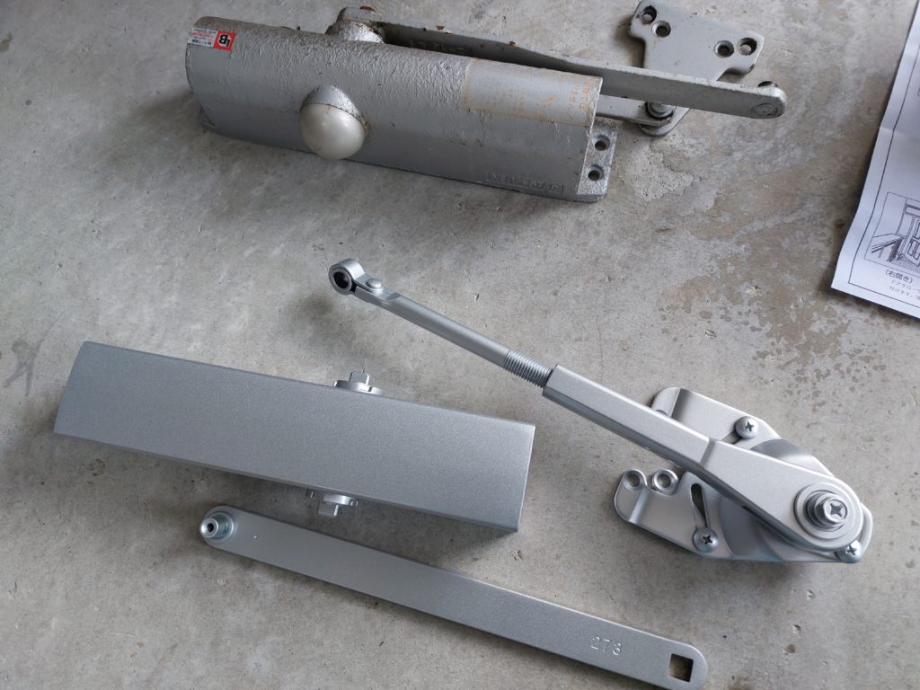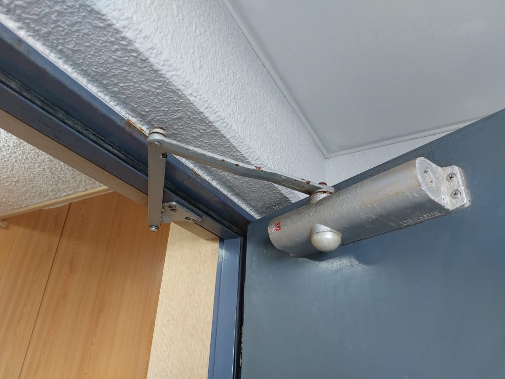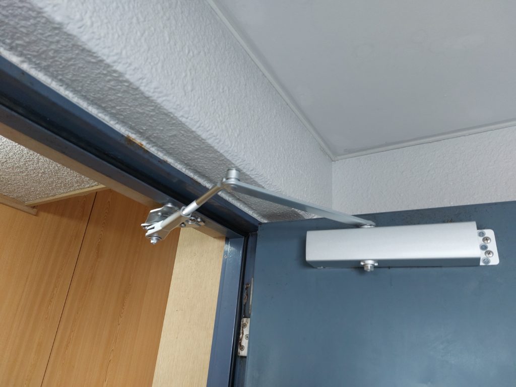 修繕:玄関ドアクローザーの取替え 投稿日: 2025年8月22日 投稿者: 事務局 弊組合員:(有)環衛開発の修繕工事をご紹介します。 玄関ドアクローザーの取替え ・ドアクローザー ドアの上部に取付けられた金物 開けた扉が急に閉じる事が無い様にゆっくりと 自動で閉じていく動作をする働きがあります。 劣化して動作が悪いので、ドアクローザーの取替えを行います。 取替え後は、開け閉めの動作確認を済ませ修繕完了です。