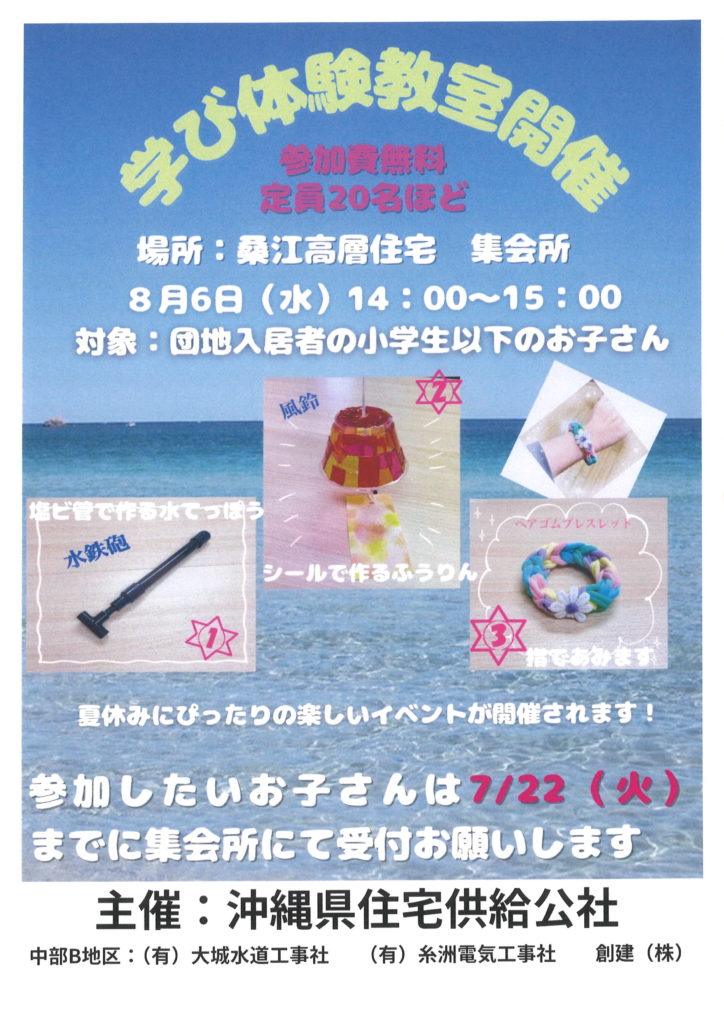 去った8月に沖縄県住宅供給公社さんと弊組合の主催で、県営団地に入居している子ども達を対象に